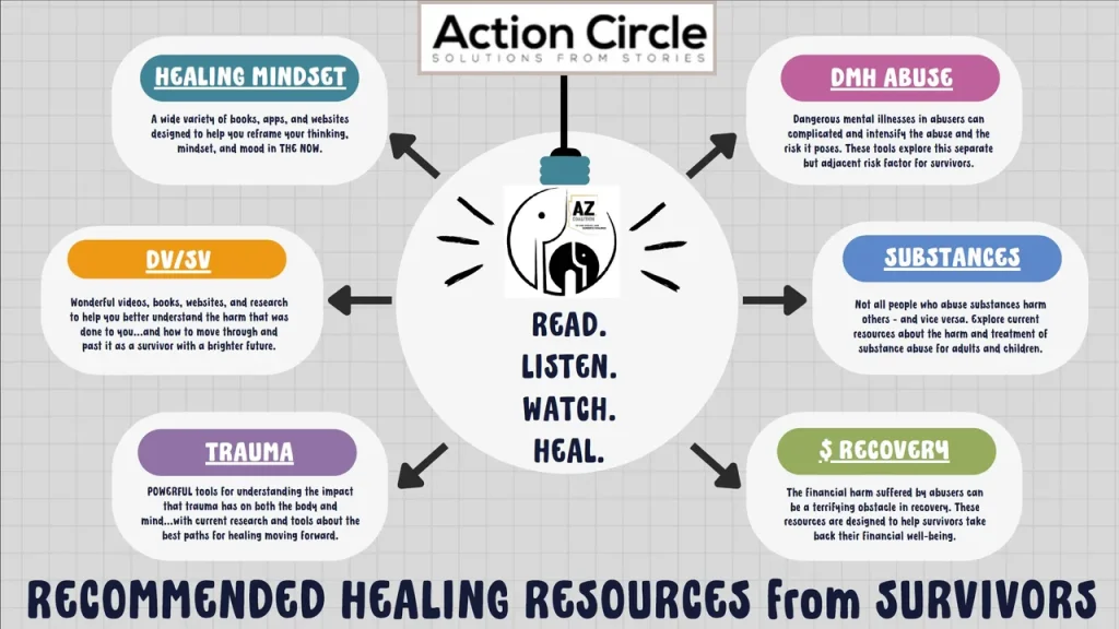 Discover impactful reading and resource recommendations directly from SA and DV survivors—each slide offers guidance, strength, and support. To view more, swipe left or tap the arrows; mobile users can zoom by holding one finger on the image and swiping with another.
